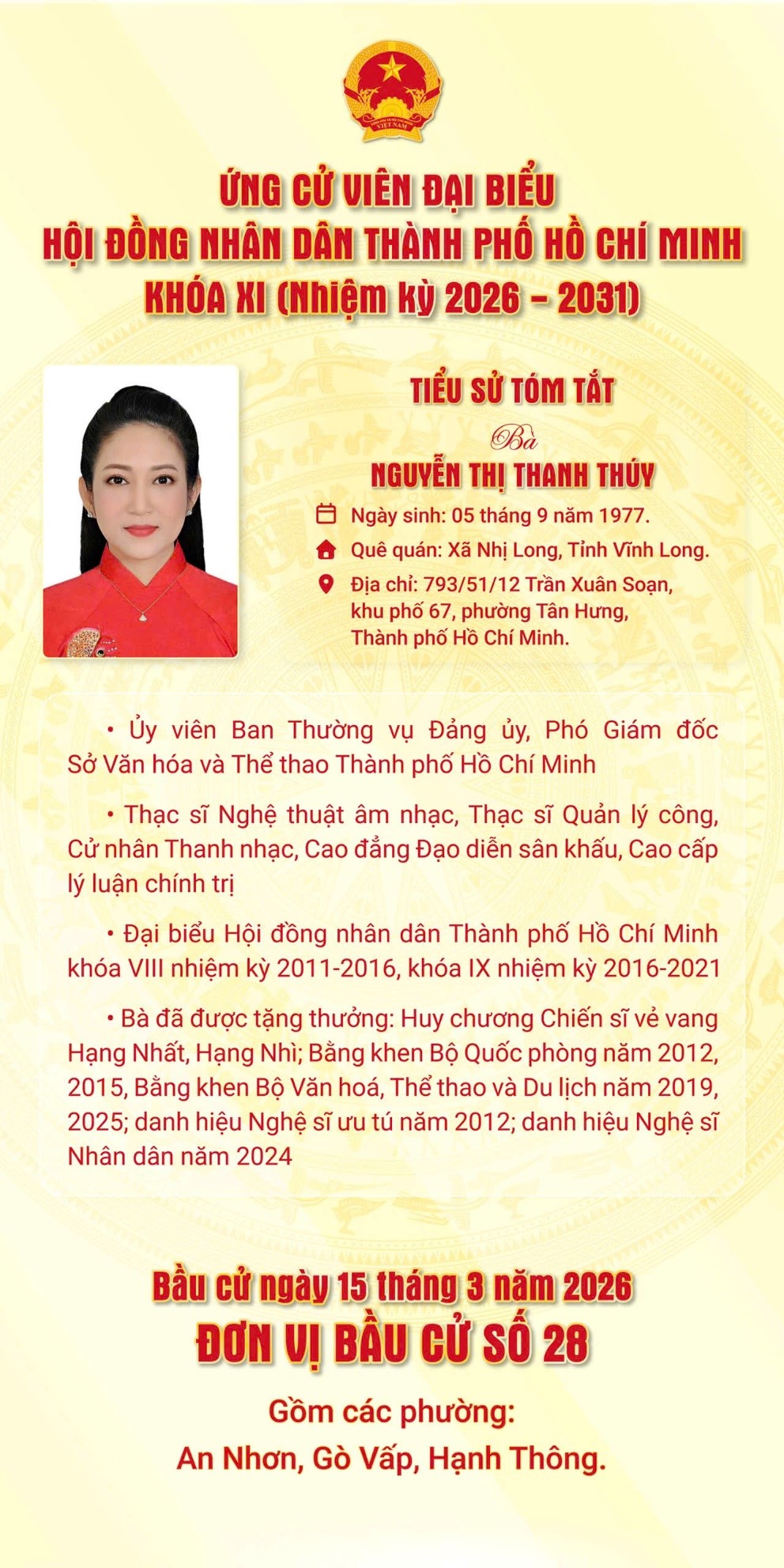 Bà Nguyễn Thị Thanh Thúy ứng cử viên Đại biểu Hội đồng nhân dân Thành phố Hồ Chí Minh Khóa XI tại Đơn vị bầu cử số 28, gồm các phường: An Nhơn, Gò Vấp, Hạnh Thông.