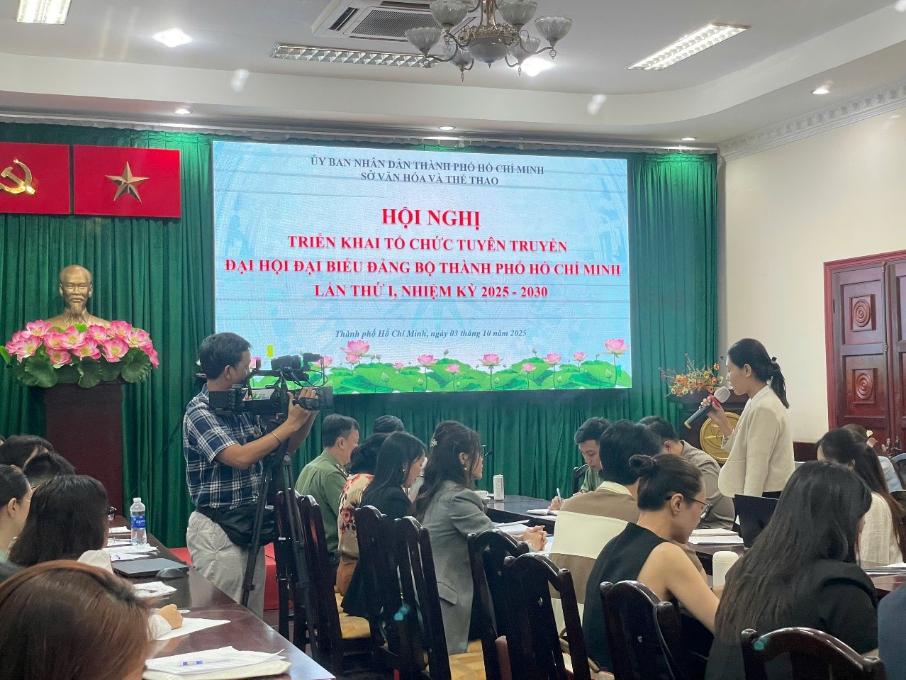 08/10/2025 08:36Chiều ngày 03/10/2025, Sở Văn hóa và Thể thao Thành phố Hồ Chí Minh (Sở VHTT) đã phối hợp với Công an Thành phố (Phòng An ninh mạng và phòng chống tội phạm sử dụng công nghệ cao) tổ chức Hội nghị triển khai tổ chức tuyên truyền Đại hội đại biểu Đảng bộ Thành phố Hồ Chí lần thứ I,nhiệm kỳ 2025 – 2030 đến các doanh nghiệp thiết lập trang thông tin điện tử tổng hợp và doanh nghiệp mạng đa kênh (MCN) trên địa bàn Thành phố.